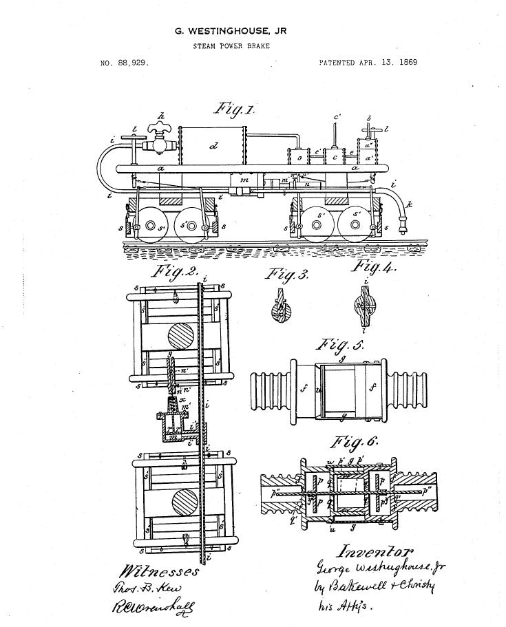 Picture of the Gare Montparnasse train accident. The train was late, but the driver should have known better, since he had 19 years of experience! Failing to come to a stop, the engine ploughed across almost 100 feet of the station concourse, crashed through a two feet thick wall, made it across a terrace and sailed out of the station to plummet onto the street 30 feet below. There were only 5 serious injuries among the 131 passengers and crew on the train. Down in the street a woman was killed (by a falling piece of masonry) and another injured.Here are the original drawings of George Westinghouse’s air brake filed with the US Patent office (1869). Westinghouse invented a system wherein each piece of railroad rolling stock was equipped with an air reservoir and a triple valve, also known as a control valve. The invention was a major contribution to railroad safety.A panorama shot of the modern facade of the Gare Montparnasse station in Paris, France.