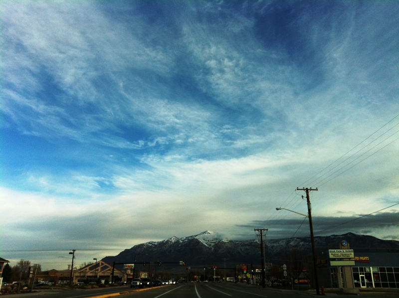 This is on the way in to work on Monday, a little later than usual so the sun was just up high enough to color the sky above the snow-capped mountains a beautiful blue. We’re in Ogden on Wall Avenue (with a strange familiar tone to it because of Wall Street?), one of the main north-south avenues.