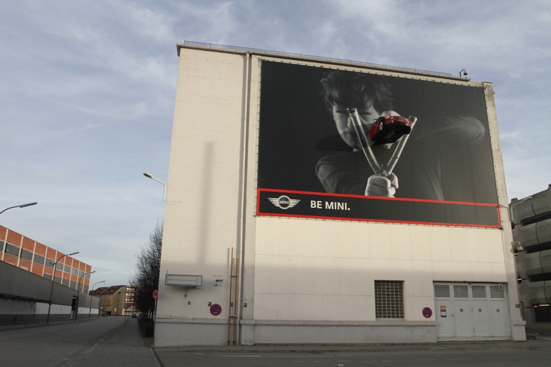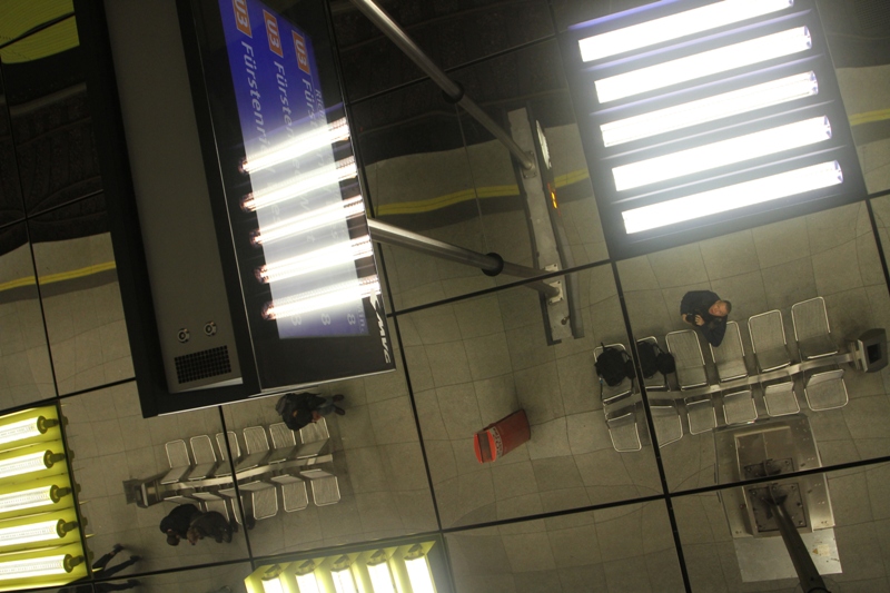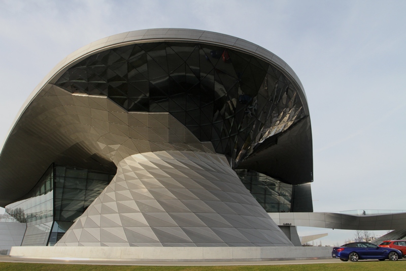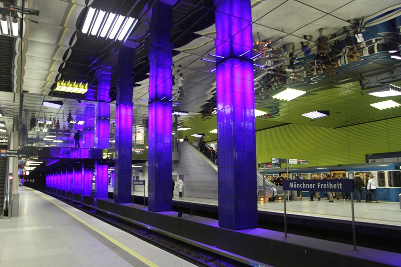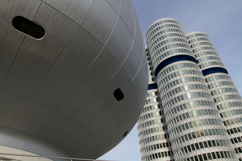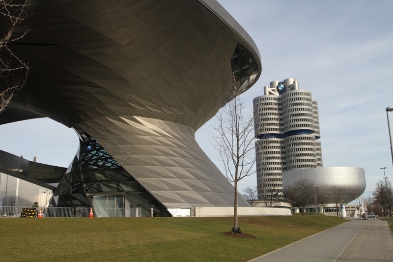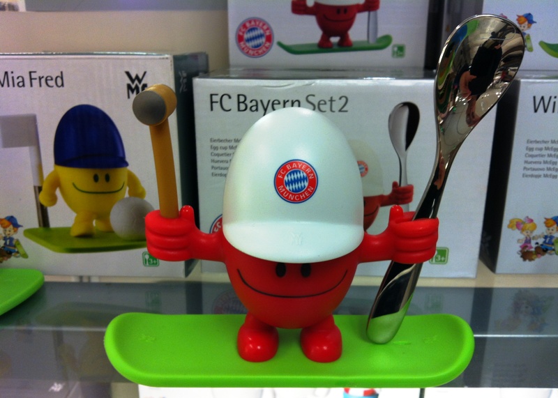 Here is the ‘tornado’ building of BMW Welt (BMW World)’s showroom and shrine to the Ultimate Driving Machine. It opened in 2007.I have now walked around the the front of the building. It was closed for the New Years weekend .. but BMW did put out some crumbs (bottom right) for the clamoring BMW Motor Machine fans that would otherwise have nothing at all to look at.These shiny buildings belong to BMW as well. The bowl is BMW Museum and the towers are BMW’s world headquarter offices.More mundane (square) offices and working area in the BMW World complex.I am now heading back on U3 to Marianplatz. This is the inside of the station.This is Munich Freiheit station also on the U3 route. The pillars are blue, but the blue is enhanced by LEDs shining from above. My camera actually added the pink.Aww.. is this the way to treat a little Mini ? (Well, it’s actually a real, full-size Mini ! ). Giant mural display ad in the BMW World complex.This is also in Munich Freiheit station, my reflection in the polished ceiling panels.The Galeria Kaufhaus homeware display sported this WMF brand egg holder for ardent FC Bayern fans (Munich based soccer club). Check out the little hammer for breaking the egg shell !