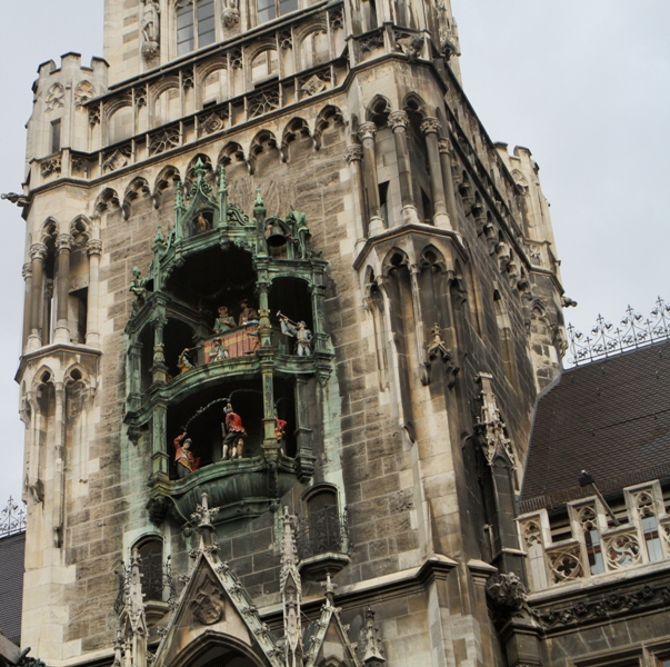 So .. what to do if you arrive on a wintry Sunday when most of the restaurants, shops and museums are geschlossen (closed)? Well, the trains still run and so you go where you can ogle some old architecture. (Hopefully today, Monday, I will get to see some newer architecture!). Marienplatz (Mary’s Square) is ground zero for the city center and that is where the New City Hall (neues Rathaus) on the north side is found .. ‘new’ being a very relative term here.