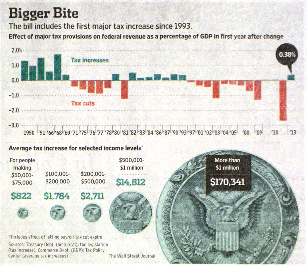 I got home in time Tue night to see the US House of Representatives vote on the Fiscal Cliff legislation. As the graphic from the Wall Street Journal shows, there just had to be an increase in taxes after all the cuts since 1993. Federal income tax rates will only go up for individuals with income over $400,000 (!) and families earning more than $450,000 .. but since the temporary 2% cut (for 2011 and 2012) in Social Security taxes was not extended, taxes go ‘up’ for almost everyone, anyway. Next up: another Debt Ceiling fight – even though Pres. Obama says there will not be one? And the estimated $600 billion of additional tax revenue (over the next 10 years) from the Fiscal Cliff legislation is still not nearly enough to address the annual deficits in the US government’s budget. After the deficit had exceeded $1 trillion for each of the last four years (total debt now at $16 trillion), it could possibly drop below that in 2013.