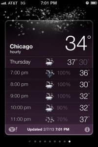 7.01 pm We have landed at Chicago, in from Pittsburgh. The snow in Chicago has started falling. I can see that, don’t need the iPhone weather app to tell me that! But what is the temperature? If it’s not too cold, the snow will melt quickly and not be a big problem for the runway and the aircraft. Well, it is 34 °F. Better get out of here before it drops to 30 °F in the next hour or so, though.
