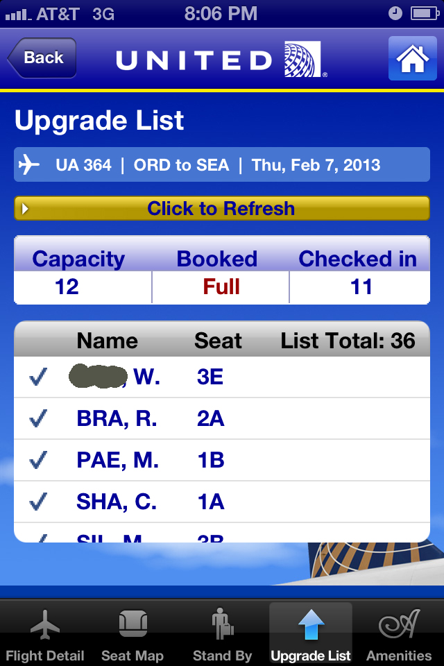 8.06 pm We have gotten to gate B5. I just have to walk over to gate B10 for the Seattle flight. Almost time to board. If I’m lucky I will get upgraded to the big seats in first class. Have I been? Yes! .. the upgrade list that used to be classified information available only the sometimes-surly ground personnel, is now available to everyone (to obsessively check every 3 minutes if you feel you have to?). That’s me in seat 3E on the Upgrade List. (Later, before we departed, the guy across the aisle in 3B made a fuss when he discovered his seat’s overhead light was not working. ‘I need it to read, my Kindle is not backlit!’, he complained to the stewardess. I knew exactly what was going to happen next : ‘Will I be so kind to consider trading seats with him?’ she asked. ‘Alright, then’ I said (thinking : Good Grief, the way that guy is carrying on, they’re going to hold the @#$% flight to call Maintenance to get it fixed. Can’t let that happen).