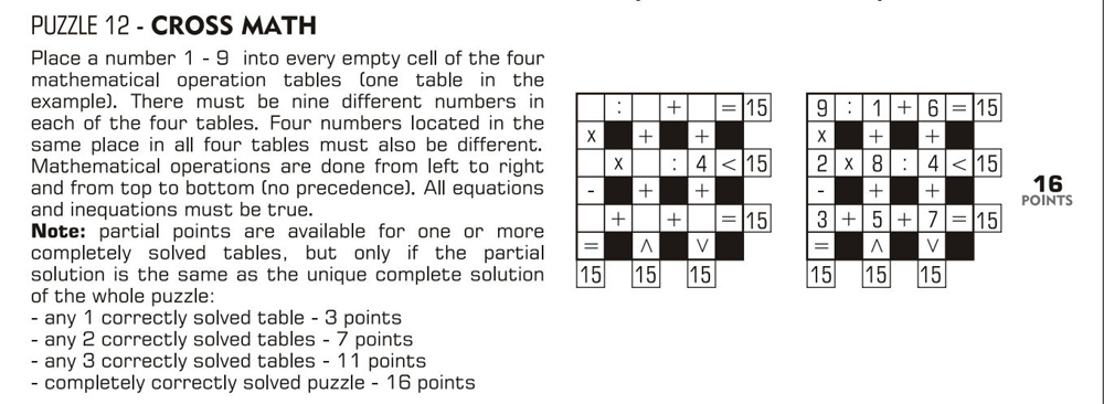 I knew there was a World Scrabble Championship, but not a World Puzzle Championship. TIME magazine recently wrote about the 21st WPC (here is the URL http://wscwpc2012.org) .. the latest one was held October of last year in Croatia. (The East Europeans like their puzzles, but the American team did very well, with Thomas Snyder and Palmer Mebane placing second and third after the winner Ulrich Voigt, a German). The instructions for the puzzles are very simple .. but the method to the madness needed to solve them, another matter. One cannot solve the puzzles by brute force, since humans are not computers (and the puzzle solvers have none at hand). So they have to come up with the heuristics – the process or method – out to solve the problem.