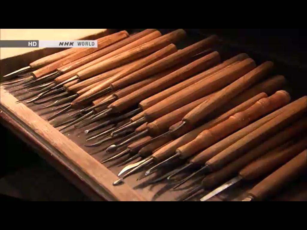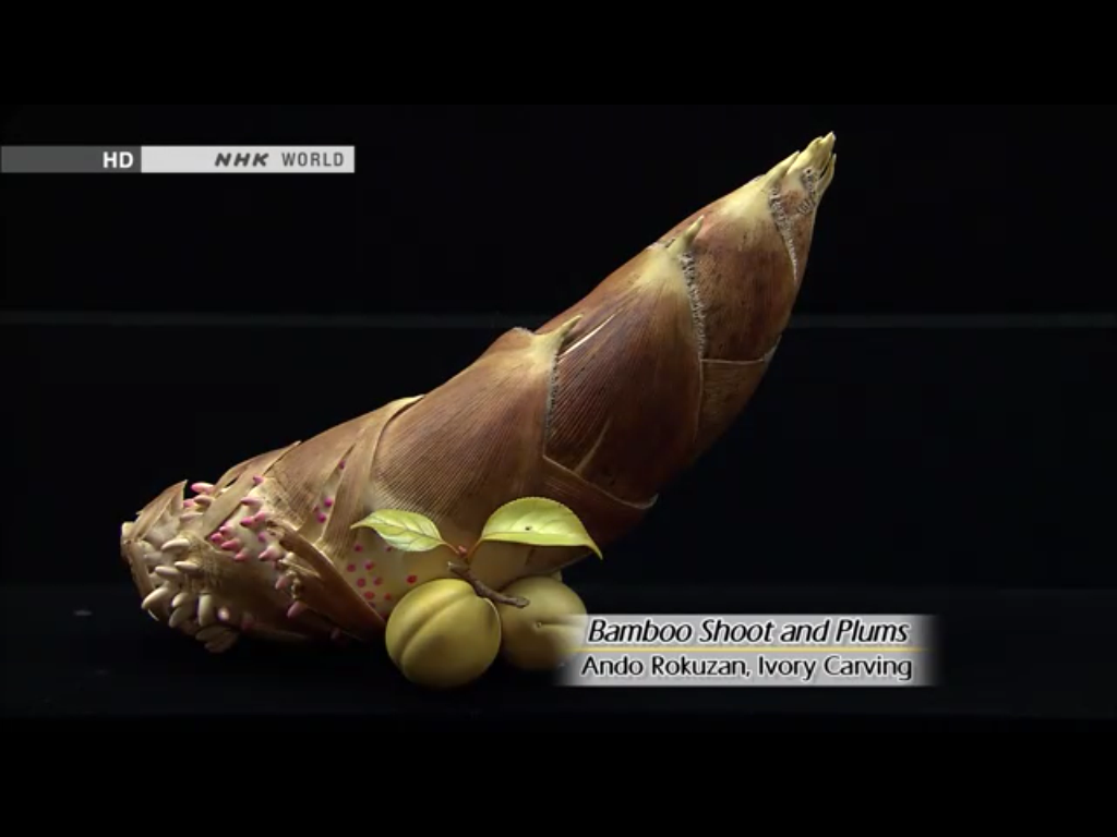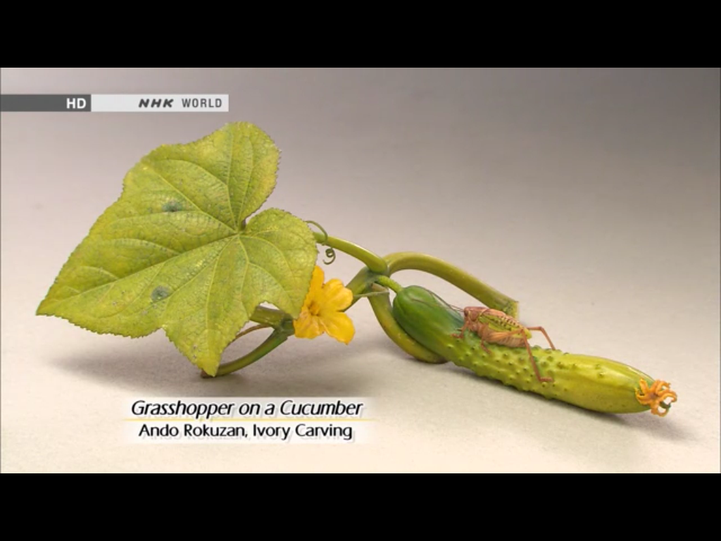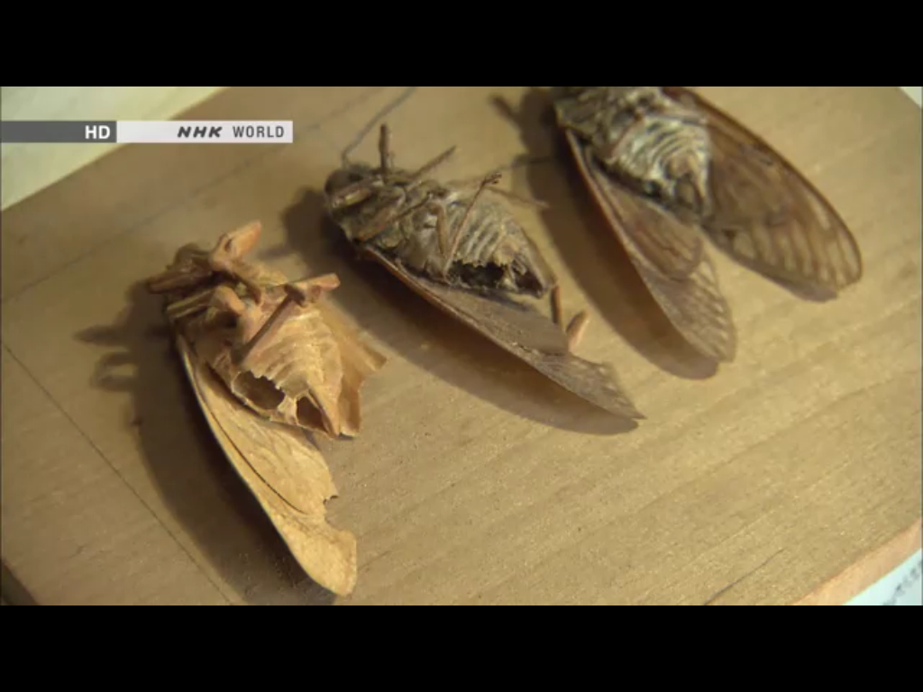 (This is a late post). I found and snapped these pictures from a documentary on NHK World’s website www.nhk.or.jp/nhkworld/. It started out with the incredible colored ivory carvings of artist Ando Rokuzan (1885-1955). I couldn’t find any of his artwork on-line .. probably because the texts for it are in Japanese. No detail was too tiny. They don’t know how he colored the ivory, and the tools that he used must have been ones he made himself. But then the curator of the art museum told the journalist of an artist called Fuyiki Maehara that lives nearby that makes wood carvings of real-life items : a tin can with an open lid and a branch with berries in it; a barbed wire; the shell of a dead cicada bug. He carved out the inside to make it hollow, carved out the detail on the wings, carved the legs of the insect — out of a single chunk of wood. He makes his tools with the same techniques that were used centuries ago to make samurai swords. Is it art, to make something that looks exactly like the thing for real? Why does the artist do it? asked the journalist. ‘I love doing it .. and to see if I could’, was the reply.