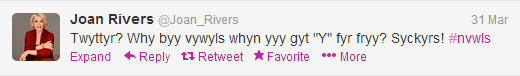 I’m happy that April 1 has come and gone, so that all the technical tomfoolery is now out of the way. Google released an April Fools video announcing ‘Google Blue’, a version of Google Mail that has been ‘years in the works’ (but it turns out all it does is be blue). Some commentators point out they are probably poking fun at a version of Windows 8 called Windows Blue that’s slated for release later this year. Google also offered a ‘Treasure’ mode of their maps and its new odor service called ‘Google Nose Beta’, with which you could search for odors or smells which would appear through your computer so that you could smell it. On Sunday, Twitter announced it will no longer allow the use of vowels in tweets, and that users will have to buy them. (Not true). Check out Joan Rivers’ creative response below.