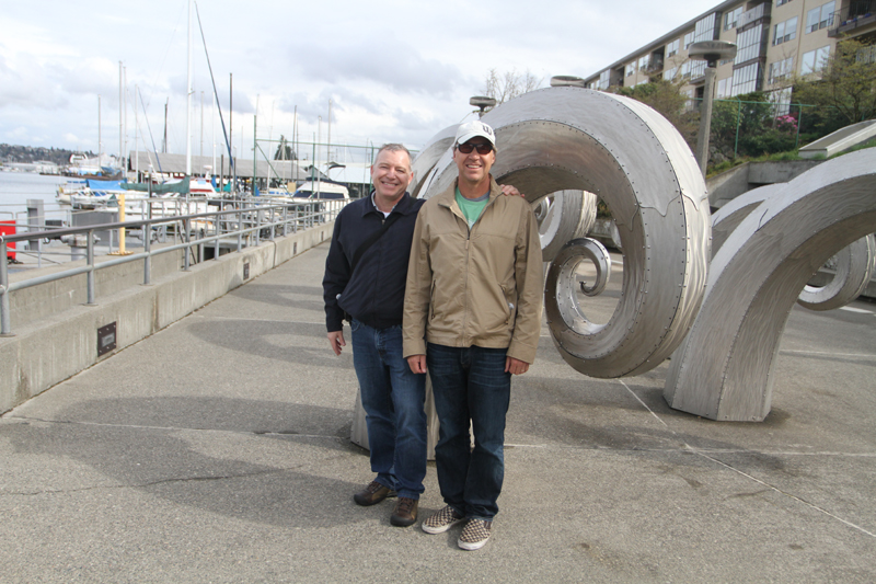 This is fresh water from Lake Union ‘overflowing’ into Puget Sound through the sluice gates of the lock system.Here is a single (lost?) little fish that we saw in the view window for the fish ladder. I am not even sure if it is a salmon. The best viewing times for the salmon run every year depend on the species of salmon. Sockeye – June, July; Chinook and Coho – Sept, Oct; Steelhead – late fall and winter.My brother and I posing at the cool outdoor artwork at the locks.