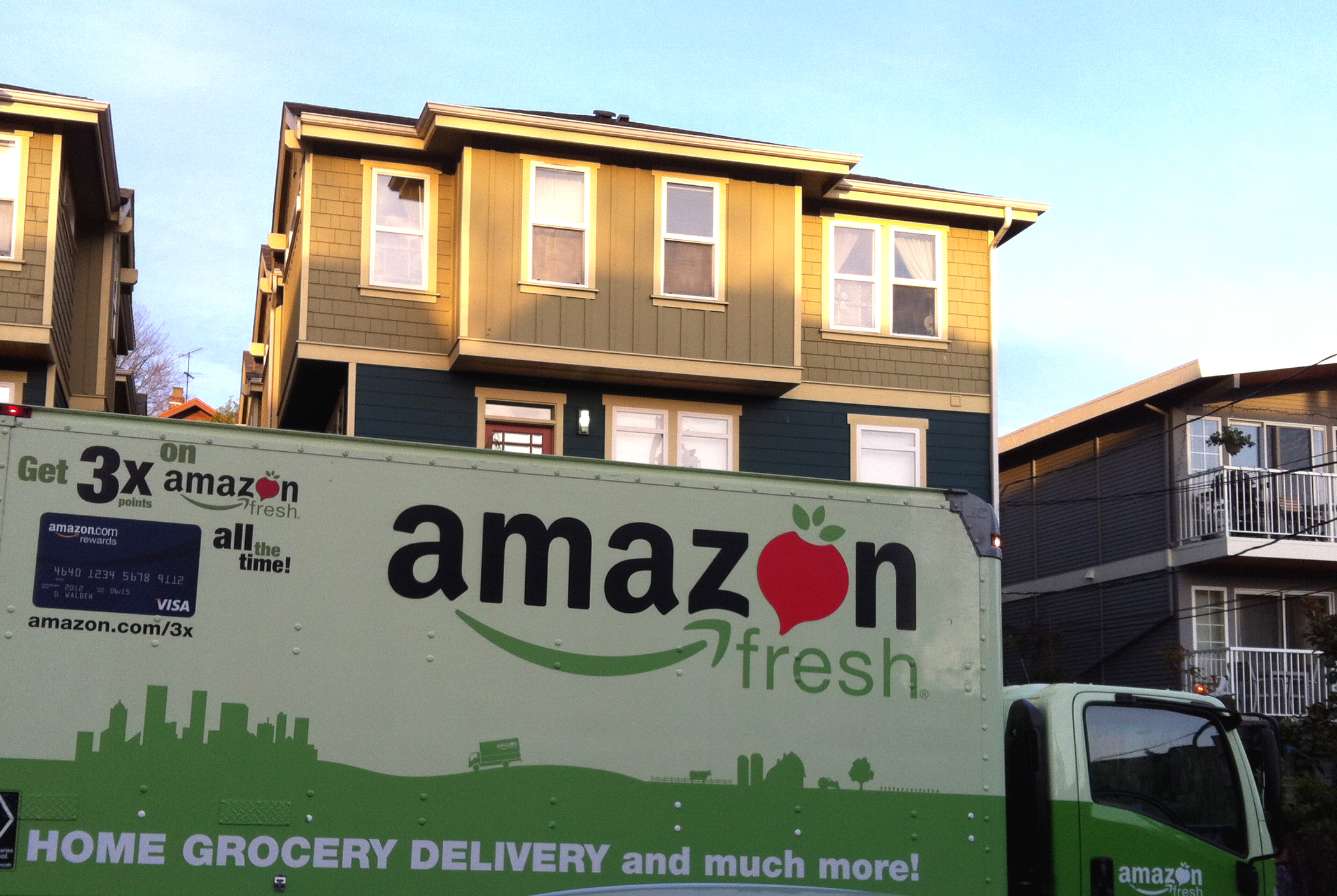Here’s the opposite direction No 43 bus across from where I was waiting. Jet City on the sign is Seattle (Boeing being the ‘jet’), and seeing ‘Johannesburg’ jolted my memory of all the times our family would drive out there to visit my grandparents. The town where I grew up is just about an hour’s drive from Johannesburg.And here’s an ‘amazon fresh’ truck that I walked by. They are still not a very common sight, and offer service only in limited areas in Seattle. One can order groceries as well as complete meals from restaurants.
