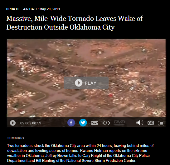 A really big tornado caused extensive damage and tragic loss of life (51 people found so far, of which 20 are children from an elementary school) in the Oklahoma City area on Monday. The tornado was more than a mile wide, with winds of 180 mph or more. It flattened everything in its wake, ripped the bark from trees with its debris and swept cars and like trucks up like Matchbox toys. There is footage of the funnel cloud and the damage on the website of the public news service PBS at this link http://www.pbs.org/newshour/bb/weather/jan-june13/tornado_05-20.html