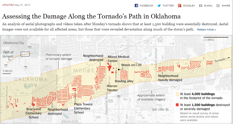 Here is a map of the damage brought by Monday’s tornado in Moore, OK. (This is just a section of the 17 miles in total that the tornado traveled). The map is from the New York Times website, with pictures as well. State officials have lowered the death toll to at least 24, revised down from Monday’s estimate. If anything, it’s amazing that not many more people lost their lives in the buildings that collapsed and the flying debris. http://www.nytimes.com/interactive/2013/05/20/us/oklahoma-tornado-map.html?ref=us