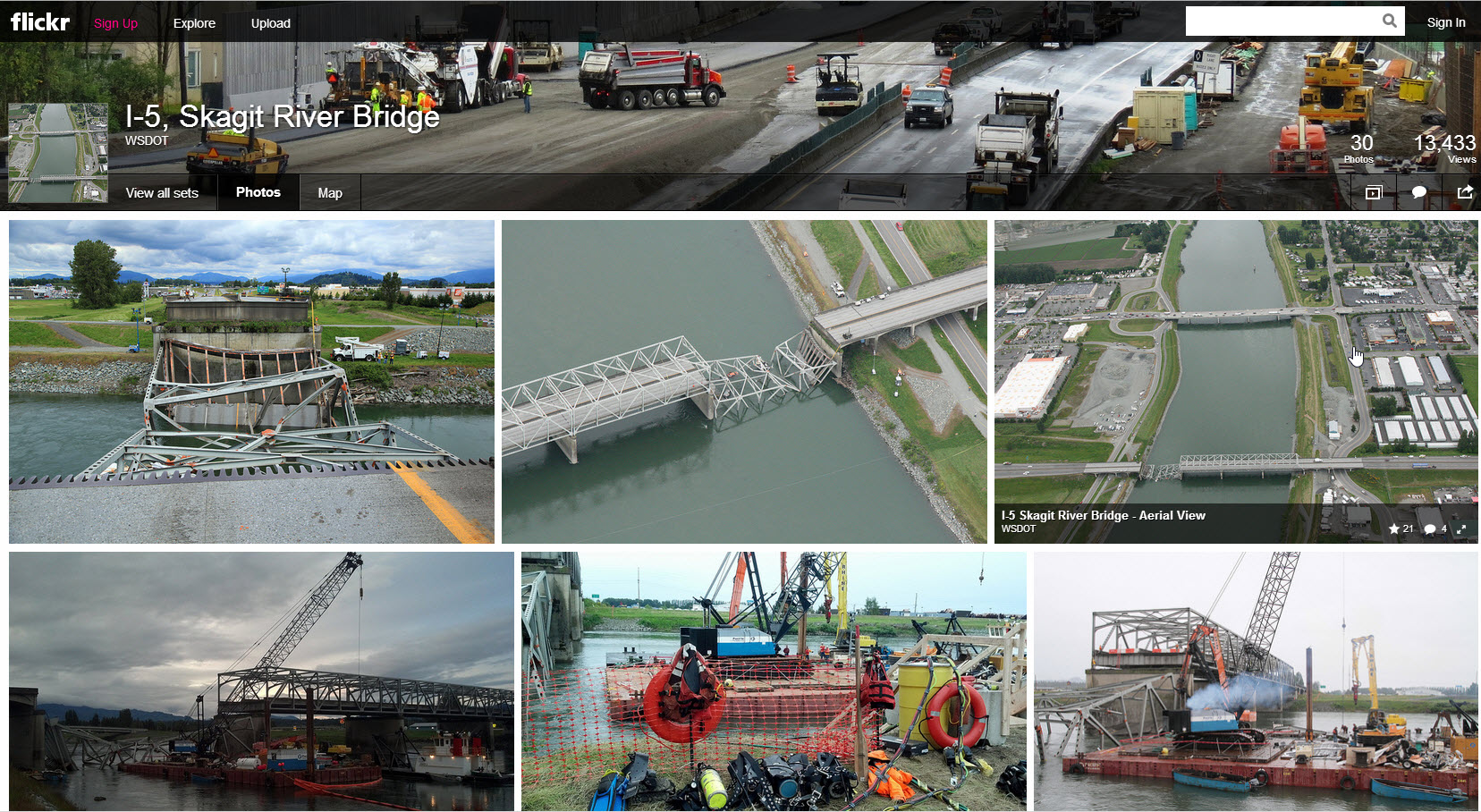It’s been a week since the collapse of the Skagit River Bridge on Interstate 5 north of Seattle. Washington State Department of Transport (we just call them ‘wash-dot’ here on the news) has dredged up the bridge section and vehicles from the river, and is getting ready to put a temporary section in place. I see Wash-DOT splashed out on Yahoo’s photo site (called Flickr) with detailed pictures. Here is the link http://www.flickr.com/photos/wsdot/sets/72157633665218854/