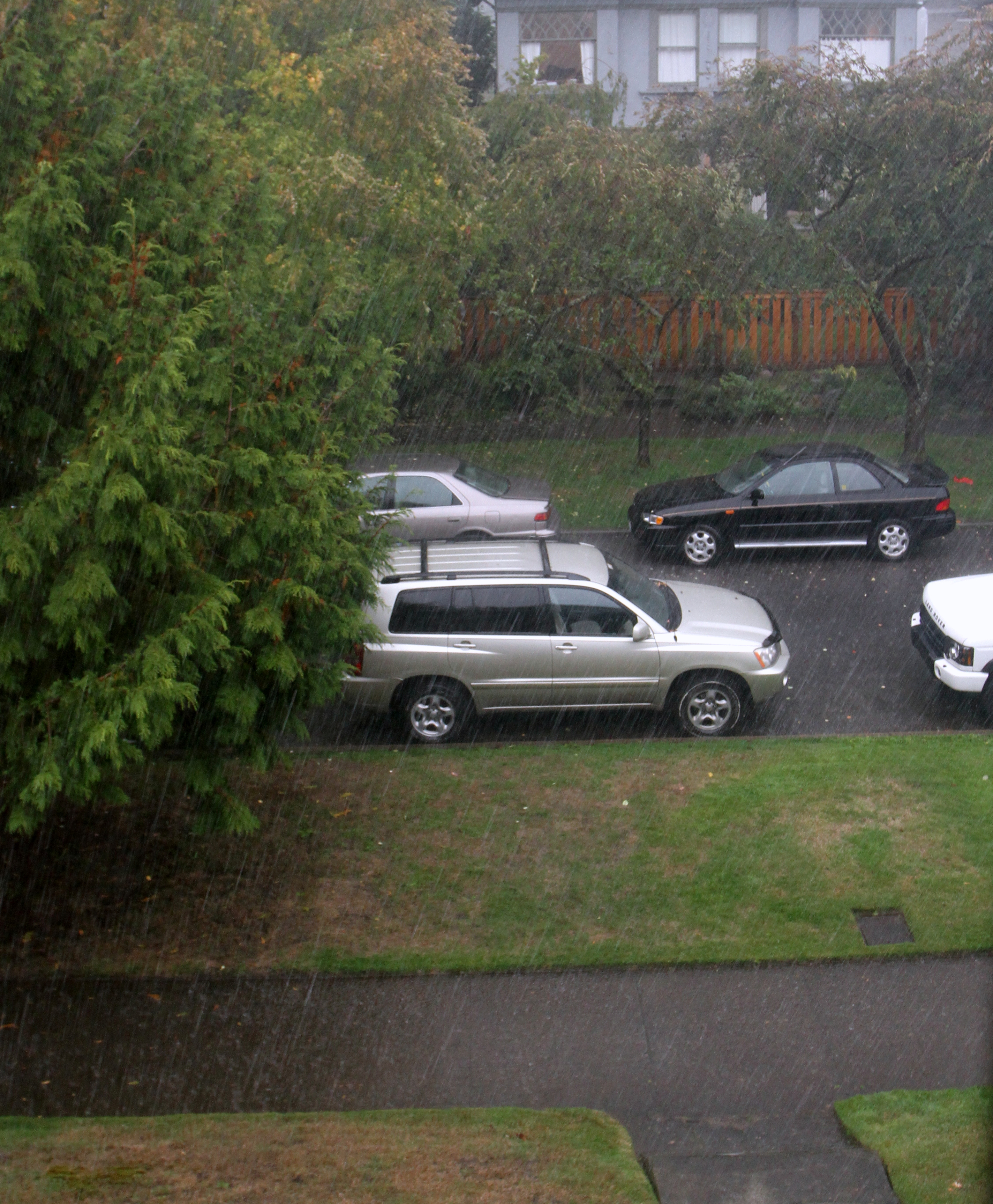 I am looking out at the street in front of my house at about 4 pm. It won’t take long for my little patch of lawn to green up completely, now that the rainy season is here.This graphic is from Cliff Mass Weather Blog. It shows that the Olympic peninsula got a whopping 5 inches of rain in 24 hours. Here in the city we had about an inch of rain.