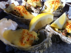 and colleague Gus arrived in Seattle for a few days of work here this week, and invited me out to lunch today. Since it was a blue sky sunny day, we picked the Seattle downtown waterfront to go to and ended up at Elliot’s Oyster House on Pier 56. Hey! We can order Oyster Rockefeller, said Gus. I did not know that’s a baked (or broiled) oyster. It’s quite good. (I’m too squeamish to eat raw oyster). We also ordered Dungeness crab cakes. I learned something new about the Dungeness crab as well. They are named after Dungeness, a small coastal community right here in Washington State.