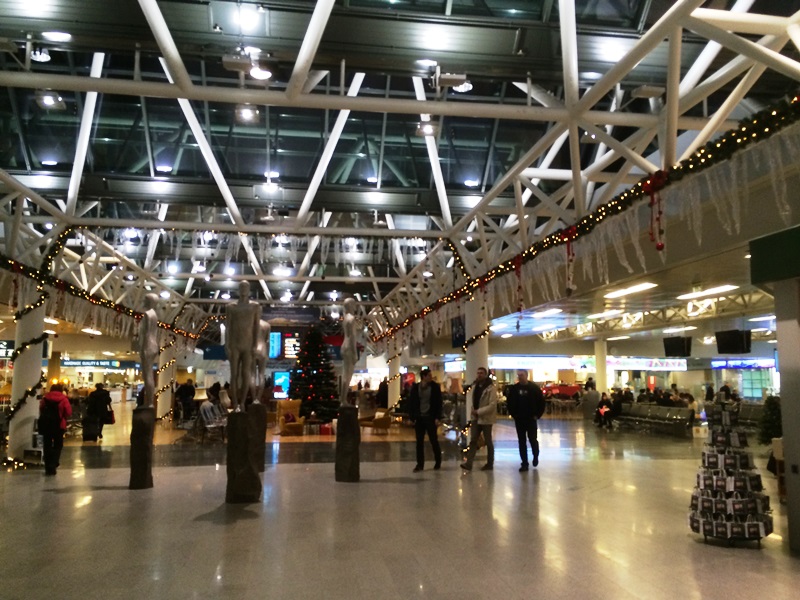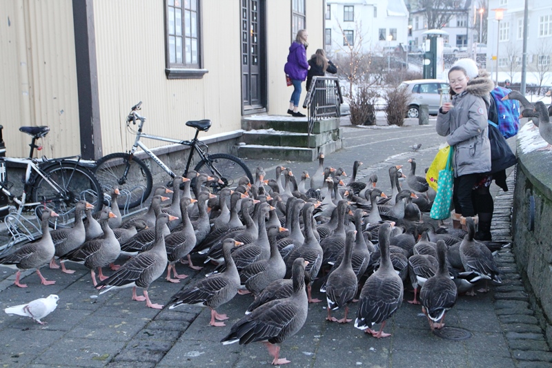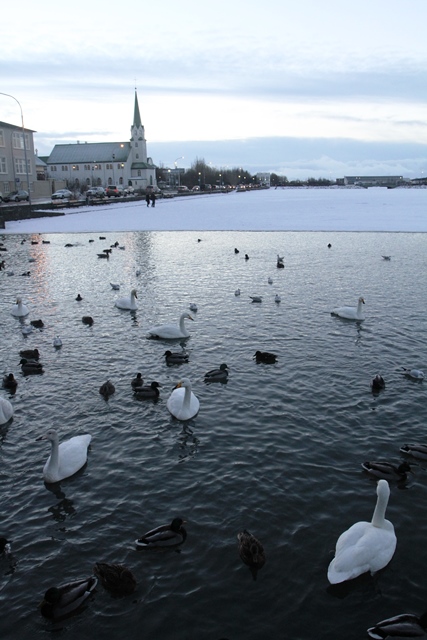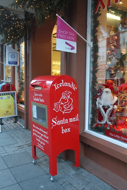 We’re just coming in for our landing at Keflavik airport.Check out the Icelandic words on the signage .. on the way to passport control.The inside of the arrivals hall.I wash my hands in a LOT of airports. And this one gets my blue ribbon award for design. There is no touching. Squirt soap from the dispenser on your hands, and hold them under the middle of this faucet-in-disguise. The water comes out. Wash your grubby hands. Then just move them both to the outside and a violent blast of air comes out and downward and dries them. Voila ! Clean hands.I assume the 1919 means the hotel was built at that time. This is the Radisson Blue 1919 that was my overnight spot.Cute wall art describing what’s available inside in the cafe.This Timberland store looks just like a gingerbread house. Can I eat it?This is a church on a high point in the city : Hallgrímskirkja by Daniel Williams. That is Leif Ericson in the statue : a Norse explorer regarded as the first European to land in North America, nearly 500 years before Christopher Columbus did.The inside of the church.A great view from the top of the church, 8 stories up. It looks serene but it is in fact is very cold and blustery where I stood for this picture.This is Harpa. [From Wikipedia] Harpa is a concert hall and conference centre in Reykjavík, Iceland. The opening concert was held on May 4, 2011. Harpa was designed by the Danish firm Henning Larsen Architects in co-operation with Danish-Icelandic artist Olafur Eliasson.The side views of the Harpa building are pretty spectacular.Looking from the inside out towards the harbor.I love this ‘Koko mjolk’ milk carton packaging. The ‘supercat hero’ says ‘chocolate milk is best ice cold’.Beautiful display with cutouts of the iconic buildings in the city. And 5 days to go before Christmas, it says.Signage on a building that says to look at the mountains .. I couldn’t get to a spot to catch all of it, though.A red roof to brighten up the whites and grays of winter.This is the Danish embassy (fort?).Sign to the Danish embassy. I like the lions.More rainbow colors in the city.Better hurry with mail for Santa !Yes, you can get a burger, fries and a small coke. Will cost you US$8, somewhat more expensive than in the USA.This little lake in the city is simply called Tjörnin (the Pond). It has a fountain in summertimeA gaggle of geese and ducks are crowding in for some FOOD. One sits on the wall and pesters the girl that feeds them.