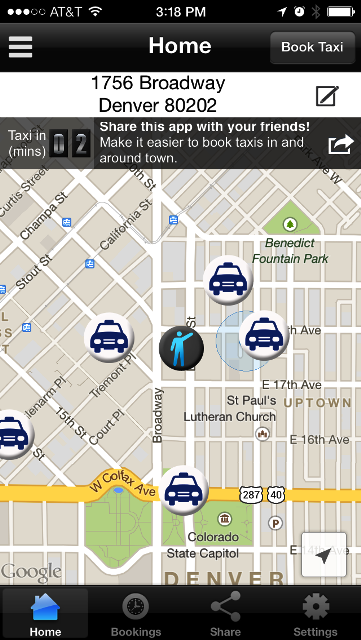My colleague and I tried a new taxi service smart phone app; this one is called Metro Taxi. It’s just a little easier to order a taxi than using the phone and yelling one’s name (and sometimes its spelling) into the phone for the dispatcher. And here in Denver there seems to be a 5 minute or longer wait time for a dispatcher every time I call the cab company.