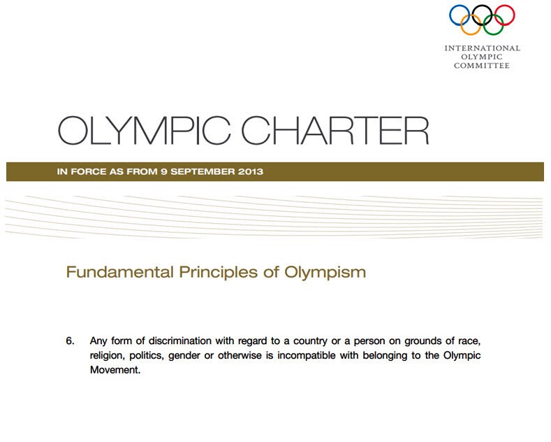 And what does the Olympic Charter have to say anyway? Well, nothing specific about sexual orientation (this falls under the phrase ‘other discrimination’ in Principle 6 of the Charter). It’s just disappointing that the International Olympic Committee did not take a stronger position, or made much about it publicly (at least not that I’m aware of).