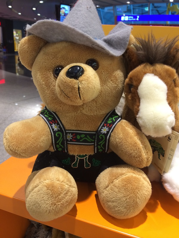 I almost bought this Bavarian teddy bear in the duty-free shop. (It’s a little too big, I thought – but maybe I should have).‘Here it is all about the sausage’, says the tag line on Hermann’s sausage stand.