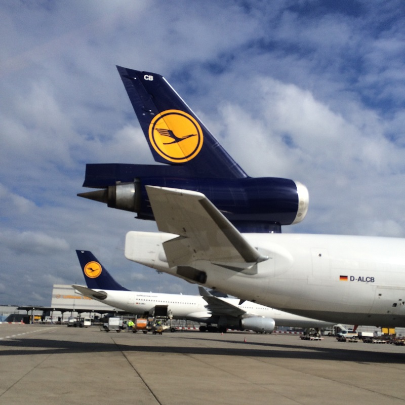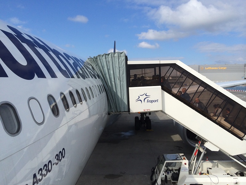 I’m checking out the blue and gold tails of two Lufthansa’s fleet from my window seat on the bus that is taking us to our aircraft out on the tarmac... and we’re boarding. It’s an Airbus A330-300. This particular type of Airbus has been in service for about 10 years.