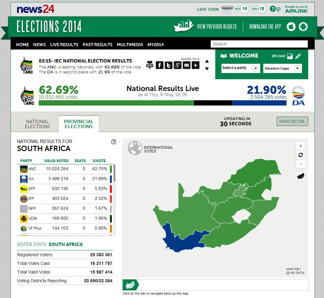Yesterday was Election Day in South Africa (the national elections is held every 5 years), so I had to check in on the results. The election is the first one after Nelson Mandela’s death, and marks the 20th anniversary since he was elected South Africa’s first post-apartheid president. As for the 2014 elections, seems to me there are no major surprises so far : the African National Congress (ANC) is on the way to win in all the provinces except the Western Cape. The Democratic Alliance holds sway there. The support for any party after these two falls off precipitously, but hey – they keep trying. There is the Economic Freedom Fighters with some support, and way, way down the list with 3,000 votes nationally, the Keep It Straight and Simple Party (KISS). The KISS party’s logo is a kiss imprint of two lips. Yes.
