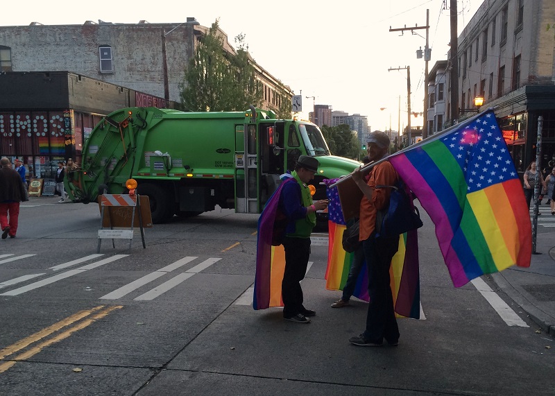 It is gay Pride week in Seattle (and several other cities in the USA, notably San Francisco and New York City as well). The first parade – more a protest march, in those days! – was held in 1974. The parade in downtown Seattle is tomorrow, but the festivities has been on-going throughout the weekend and especially on Capitol Hill here in Seattle. Bryan, Gary and I took a walk around Pike-Pine Streets and down to Broadway to check out the revelry (after which we called it a night and went home!).