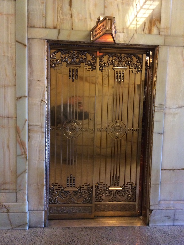The beautiful brass doors in the lobby that for the elevator that goes up to the 33rd floor. The marble was quarried from Tokeen on Marble Island in southeast Alaska.