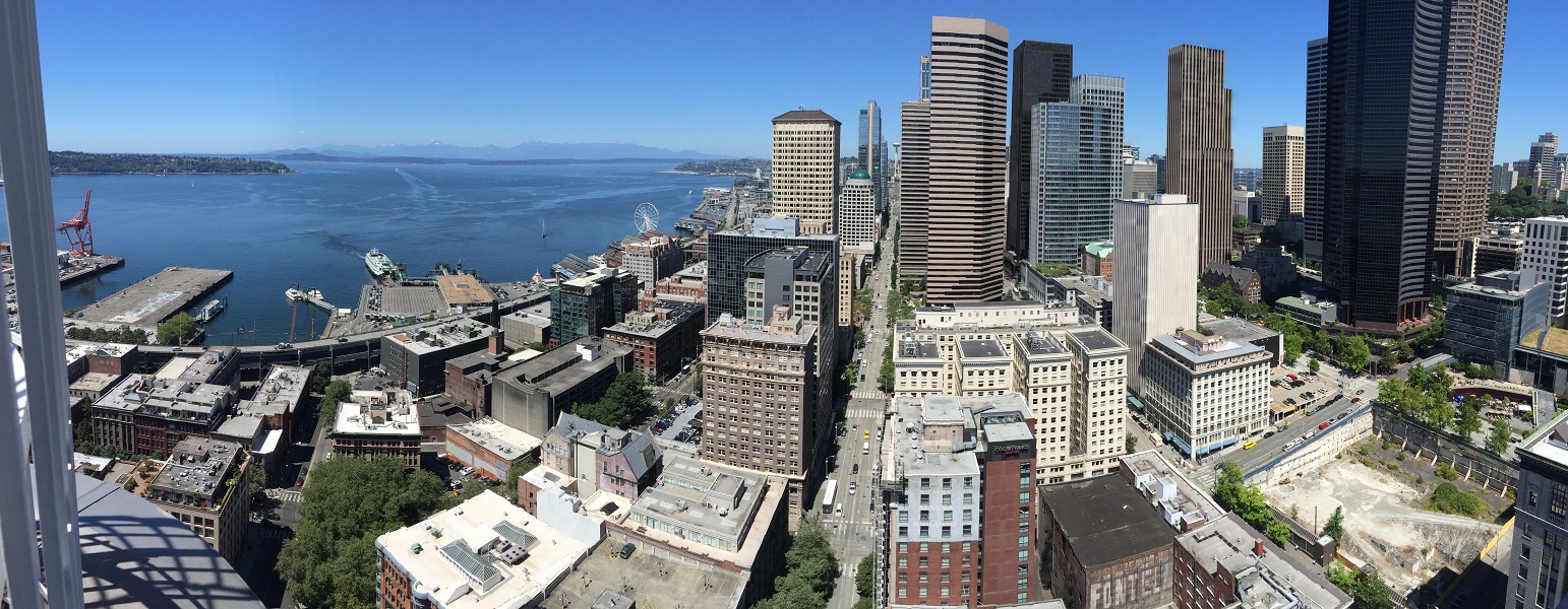 So since I was just a block away from Smith Tower, with another beautiful blue sky summer day here in the city, I decided to go up to the observation deck. The elevator on the 33rd floor opens into the Chinese Room, a large room decorated with Chinese artwork, wall and ceiling paneling and furniture. Legend has it that the room was furnished by the last Empress of China as a gift to Mr. Smith. (New York tycoon Lyman Cornelius Smith).