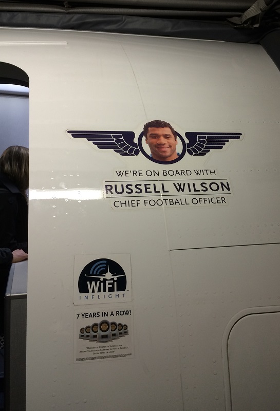 mug appears on some Alaska Airlines planes. He is the ‘Chief Football Officer’. Passengers with a No 3 Russell Wilson jersey are invited to board early with the frequent flyers.