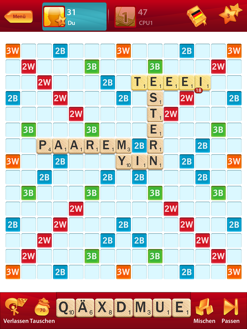 My enthusiasm for playing Scrabble against my iPad has not waned, and shows no sign of doing that. In fact, I discovered I can switch to German, if I ever get tired of English (sadly, there is no Afrikaans on-line version of Scrabble). The iPad comes up with words that make one say ‘Say whaaat? Are you sure about that one?’ .. such as TEEEI. What is that? Then you realize it is TEE EI = tea egg, just written together. The others are PAAREM = a couple of (PAAR = pair), ESTER-N = plural of ester (a chemical compound), and YIN of course from ‘yin and yang’. And check the bizarre combination of tiles on my rack : Q (with a U, luckily), X and the weird A with the umlaut.