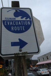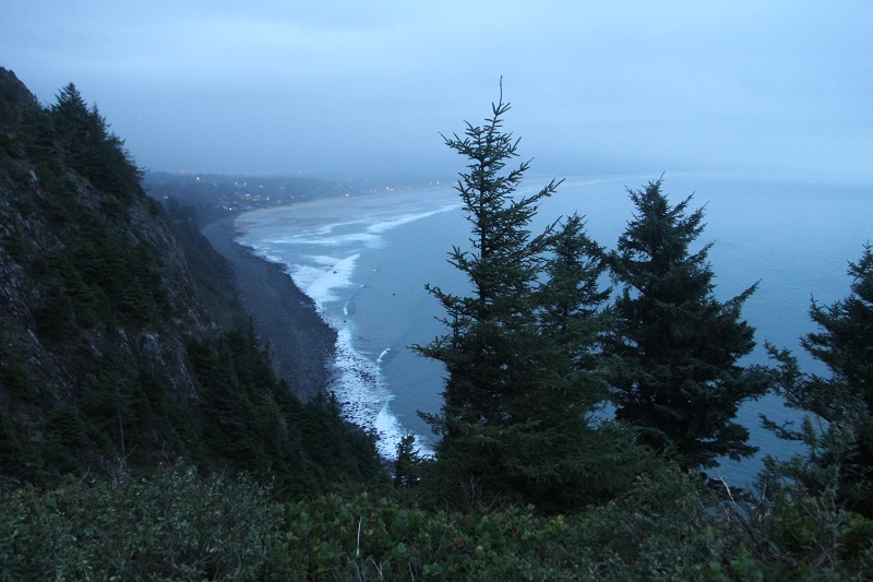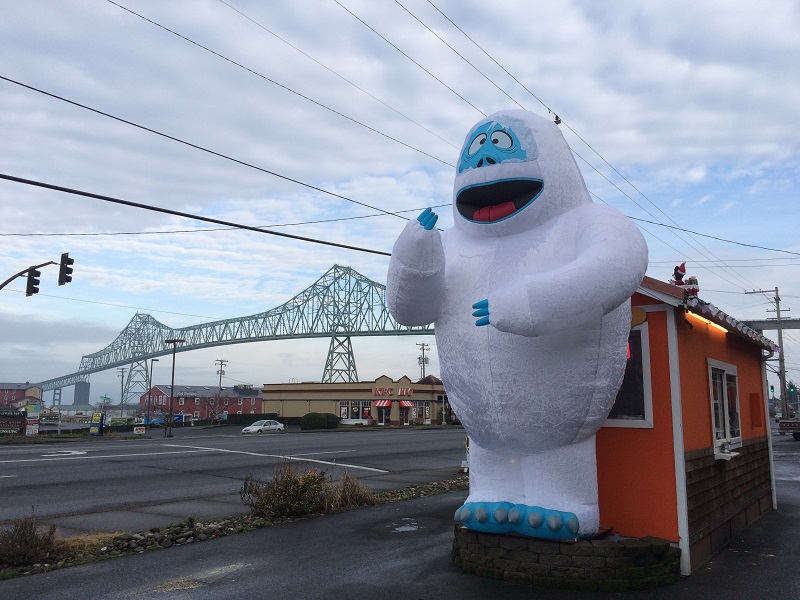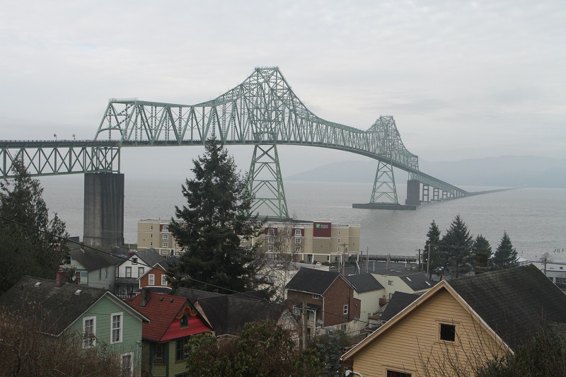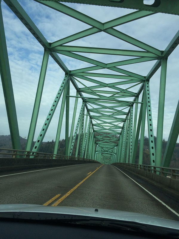 This tsunami evacuation route sign is in the little downtown area of Cannon Beach. In 1964 an earthquake in Alaska triggered a tsunami that reached a height of almost 13 ft (4 m) at Seaview, Washington. Geological evidence also shows that around 1700 a powerful earthquake (magnitude 8 to 9) and large tsunami hit Washington’s coastline.This late afternoon picture is from a viewpoint on the west shoulder of Neahkahnie Mountain, looking south. We’re on a cliff about 1,661 ft (506 m) above sea level.This is Saturday morning on my drive back to Seattle. The Abominable Snowman advertises coffee from the little orange espresso stand behind it.Before I went onto the bridge, I drove up a hill overlooking the Columbia river and the Astoria-Megler bridge. (I am looking north toward Washington State on the other side). The main span is a 2,468-foot steel cantilever through truss, and is flanked by five steel deck trusses, and one hundred forty 80-foot concrete deck girder spans.Here is a picture taken by someone while crossing the bridge.