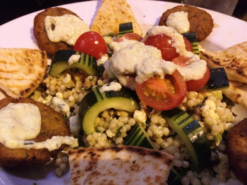 I’m hardly ever home on IMG_6794 smWednesdays, but tonight I was – and I could go out with my friends for a bite and a beer.  I had falafels with tabbouleh at the Elysian Pub tonight. Tabbouleh originated in Syria and Lebanon, and has become a popular ‘American ethnic food’, says Wikipedia.   The version of it that I had, had pita bread, falafel, cherry tomatoes, couscous, feta and cucumber.  It was very good !