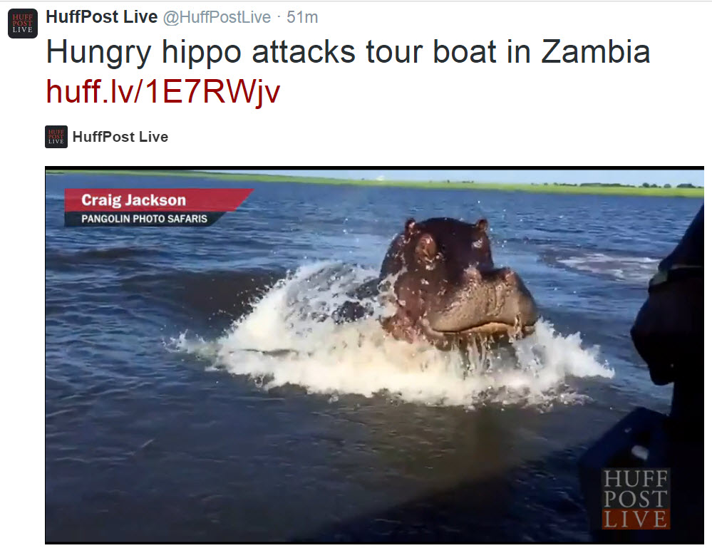 I saw an amazing clip on TV today1-16-2015 10-05-41 PM of a hippo chasing a boat with tourists in Zambia.  I found it on the Huffington Post Live’s website, here. The hippo is Africa’s most dangerous animal : more so than lions, leopards and crocodiles.