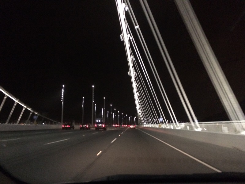 Here’s a ‘dash cam’ picture from of the San Francisco Bay Bridge at night, as I drove across it at 1 am on Monday morning. (The ‘dash cam’ is my iPhone, running Google Maps as I drive. I just pressed a buttons to take the picture).