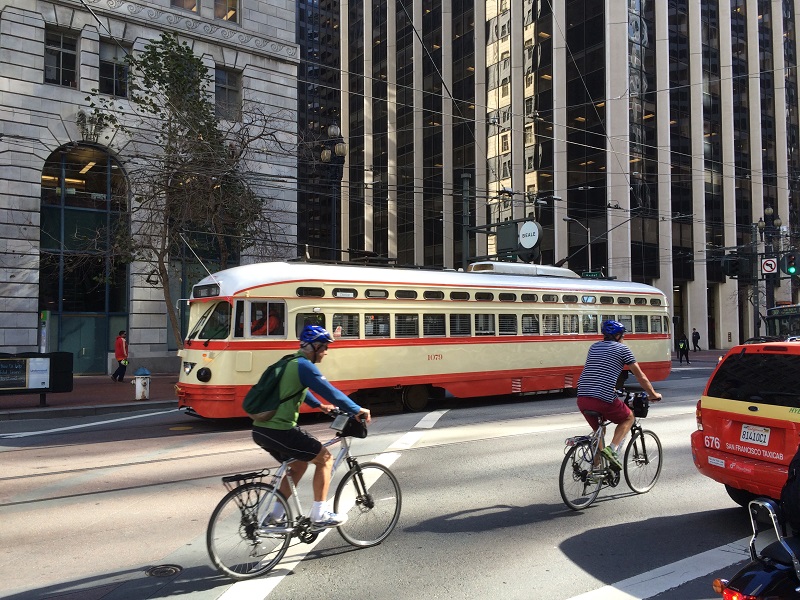 [From WIkipedia] The F Market Line (historic streetcar service) in San Francisco, opened in 1995, runs along Market Street from The Castro to the Ferry Building, then along the Embarcadero north and west to Fisherman’s Wharf. This line is run by a mixture of PCC* cars built between 1946 and 1952, and earlier pre-PCC cars.