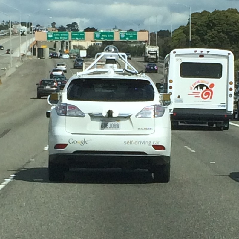 I made my usual run out to San Francisco on Monday morning. Check out the Google self-driving car that were in front of us as we left San Francisco airport, driving north on highway I-80 to San Francisco. It’s full of gadgets, and it did have a driver in attendance, but his hands were not on the steering wheel. The car made a lane change past a slow vehicle – automatically, I assume – signaling correctly each time before it changed lanes.