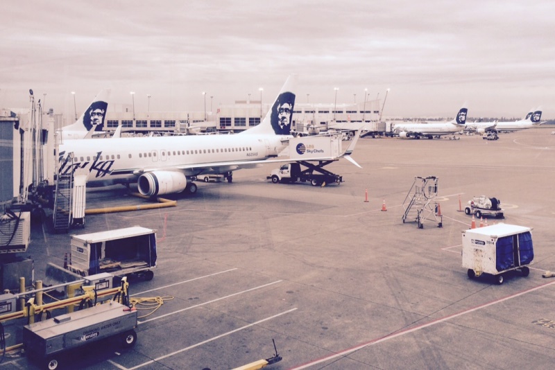 Posted on April 13, 2015 by WillemMonday/ to San Francisco It was a grey morning in Seattle, and a foggy one in San Francisco, and so we had to wait for an hour before we could take off. Several Eskimo faces on Alaska Airlines aircraft tails at Seattle-Tacoma airport’s D concourse this morning.