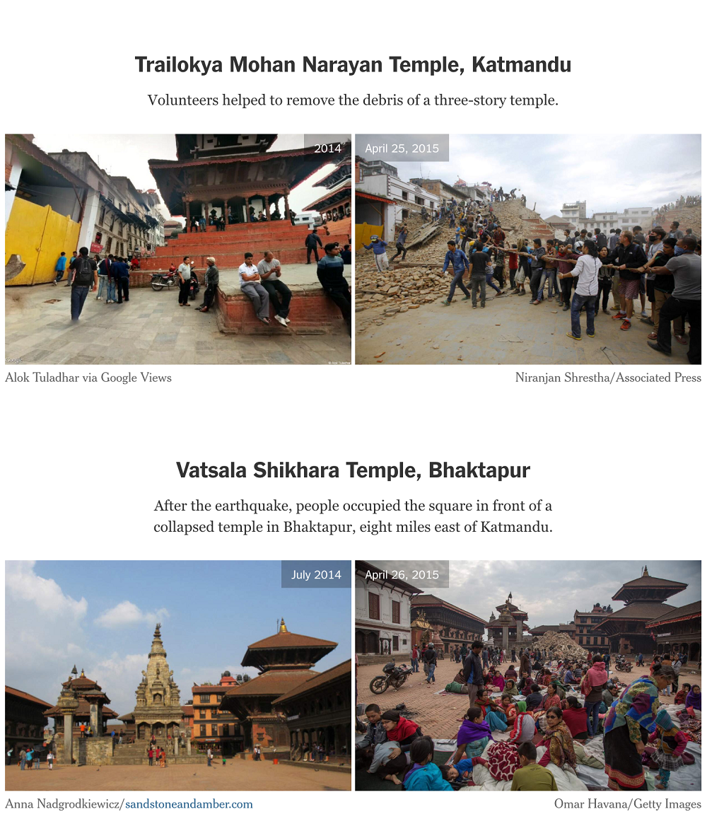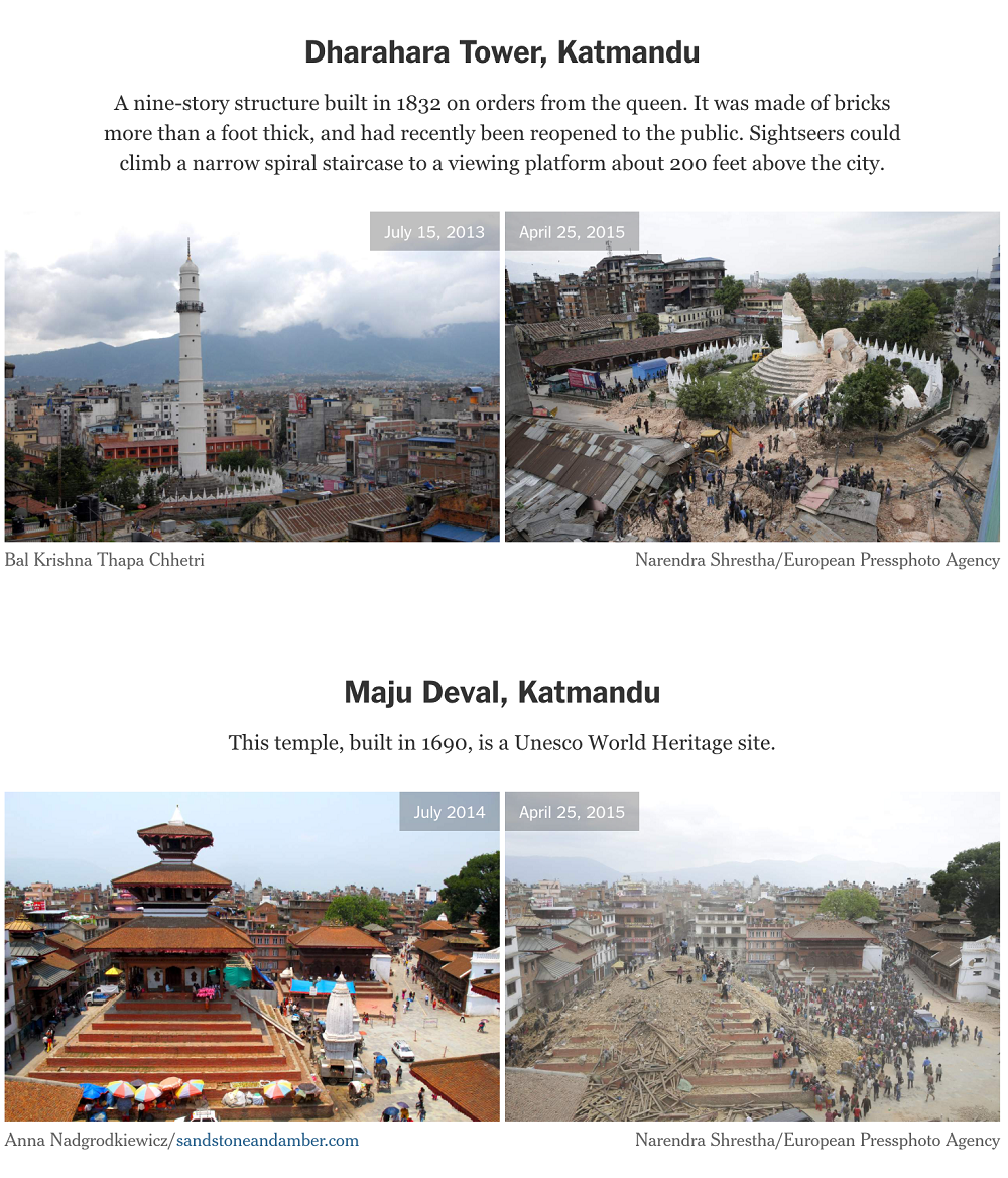 The death toll had climbed above 4,000 in the Nepal earthquake by Monday night. Several historic buildings in Katmandu were destroyed (pictures below, from the New York Times).