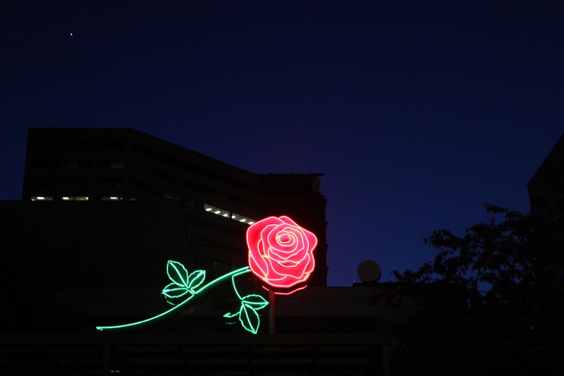 are from Saturday night. The neon rose is from a bike repair shop on the waterfront on the Willamette river.