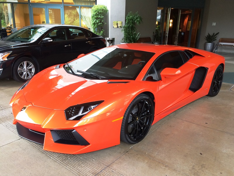 This Lamborghini Aventador was parked at the hotel entrance here in Walnut Creek today.  Beverley Hills Lamborghini said the frame around the license plate.   Assuming this is a 2014 or 2015 machine, it must have set its owner back some $430,000.    That princely sum would be good for four top-of-the line Teslas, and then some.