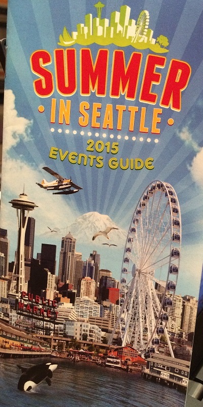 say here in the USA that Memorial Day is the unofficial start of summer. So here is the (somewhat cheesy) cover of a brochure of the summer events scheduled for the Emerald City. Check out the orca frolicking in the foreground right by Pier 57 (where the Ferris Wheel is) .. a very unlikely sight!
