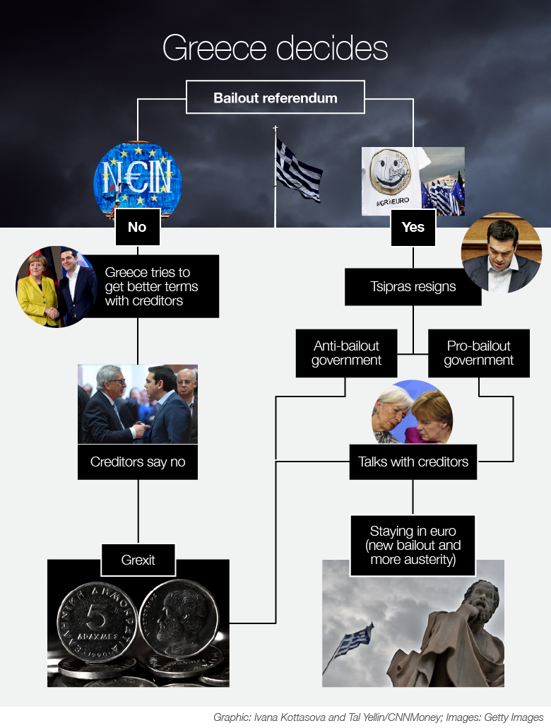 So now there is a referendum on Sunday, which makes no sense in a way. As the New York Times says : Imagine the fate of your country hangs on a yes-or-no question. The question is drafted in cryptic, bureaucratic language and asks you to decide on an economic program that no longer exists. Leaders in neighboring countries are begging you to vote yes. Your government is begging you to vote no.