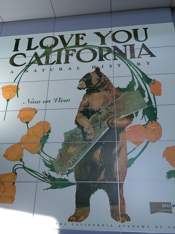 Here’s a bear – I am sure a California grizzly bear* – holding the State of California in its paws. The flowers are California poppies, the State flower. (There is little natural history exhibit on display in the International Terminal at San Francisco airport).