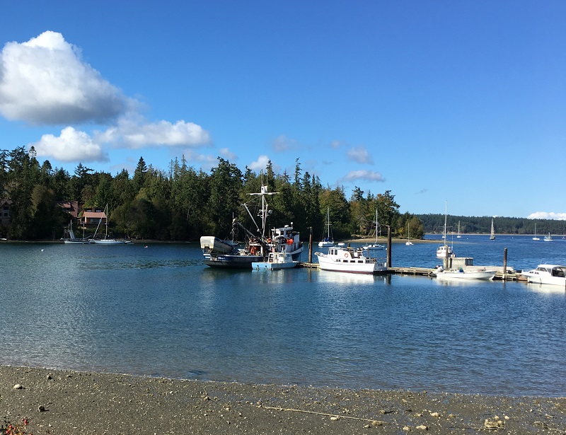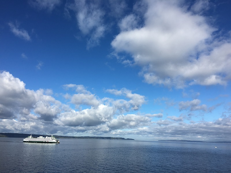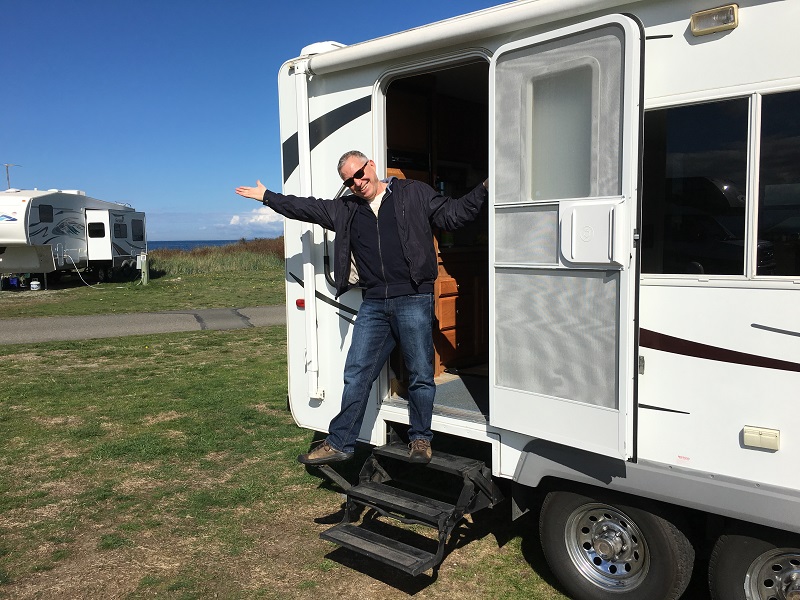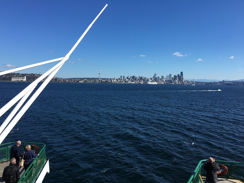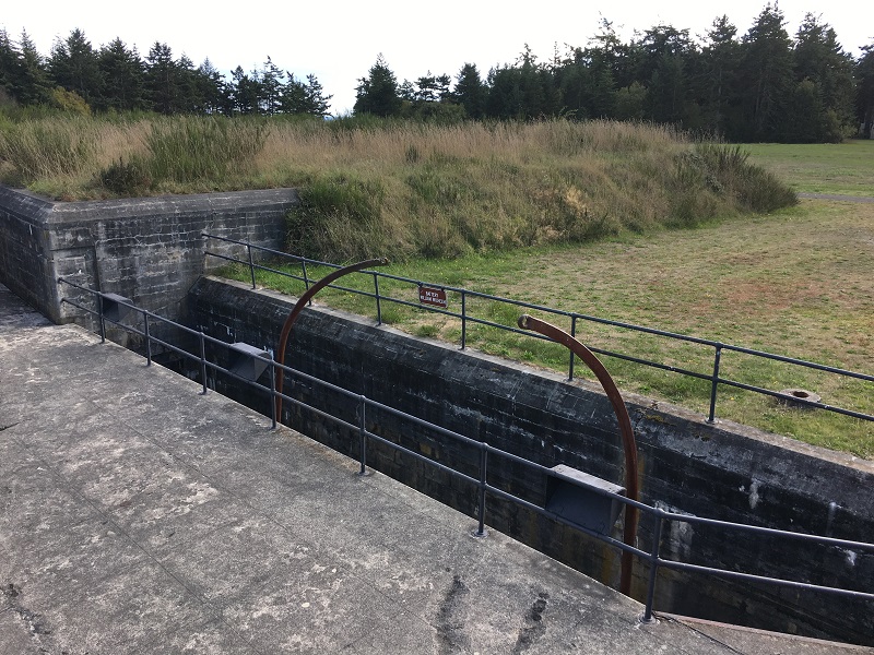 Here is the location of the State Park. I took the Edmonds-Kingston ferry to get there. There’s two islands : Indian Island, which is occupied by the Naval Magazine (storage of Navy munitions and providing other logistic support) and Marrowstone Island of which all of the northern part is the State Park.This is the Edmonds to Kingston ferry crossing, on the way to Kingston (so the ferry in the picture is going to Edmonds).Welcome to our humble abode! On the steps of Paul’s RV trailer in the Ft Flagler State Park’s trailer camp. It was sunny but not very warm (and we did roll out the awning mounted on the side of the trailer).This is a view from the bluff to Marrowstone Point. There is a pebblestone ‘beach’ down there, and a rifle range that had been abandoned after Work War I, said the sign by it.Here is what remains of one of the spots where heavy battery equipment was mounted (just about all of it removed and melted down as scrap metal during World War II). Fort Flagler, along with Fort Worden and Fort Casey, once guarded the nautical entrance to Puget Sound. These posts, established in the late 1890s, became the first line of a fortification system designed to prevent a hostile fleet from reaching such targets as the Bremerton Naval Yard and the cities of Seattle, Tacoma, and Everett.A dugout that is part of a series .. this one called the William Wilhelm battery. OK!This is inside a fortified outlook post. There are little lookout windows faced to the Puget Sound on the other side.A fishing trawler of sorts, and assorted boats at the village of Marrowstone on Marrowstone Island.Making my way back to the city, this time on the Bainbridge-Seattle ferry. It’s a little further south to drive but this ferry is bigger than the Kingston-Edmonds one. (So when there are lots of cars you have a better shot at making this one and not having to wait for the next one!).