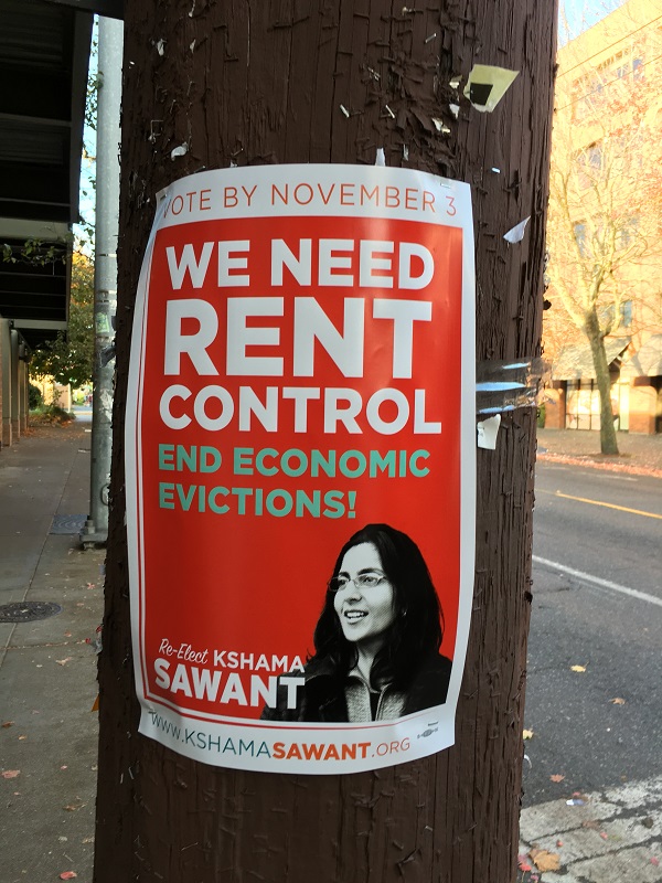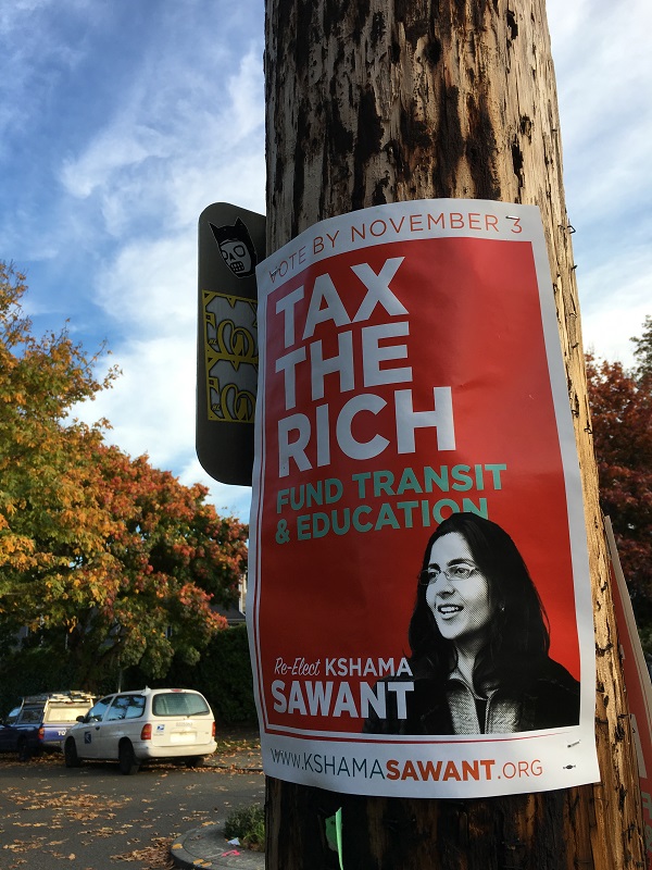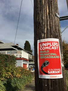 Further out to the left on the political spectrum here in the race for one of the seats for Seattle City Council, we have a true socialist : Kshama Sawant (as far as I can tell from her eye-catching Soviet-era red* campaign posters). *A bad choice of color? Or maybe she wants people to see red. Check ’em out below. Comcast is a cable TV and internet services provider.