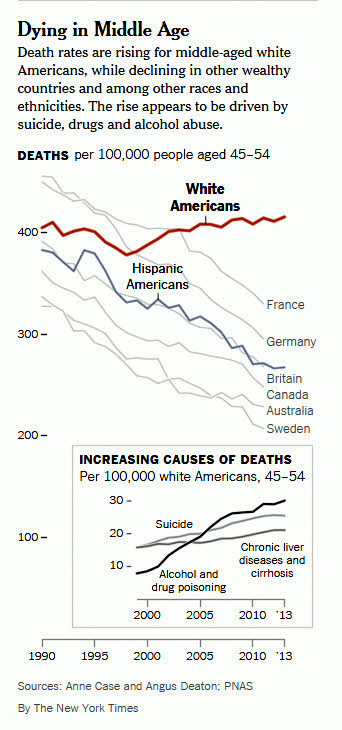 The death rate diagram below is from Monday’s New York Times, from a study by two Princeton economists. It shows the shocking counter-trend of death rates for middle-aged white Americans. They do worse – far worse than any other industrialized nation – and worse than any other race and ethnic groups in the USA (African American, Latino, Asian), and other generations. And no, it’s not the big killers like heart disease and diabetes, says the article, but an epidemic of suicides and afflictions stemming from substance abuse: alcoholic liver disease and overdoses of heroin and prescription opioids. The article shot to the top of the most-emailed list, and attracted nearly 1,900 comments.