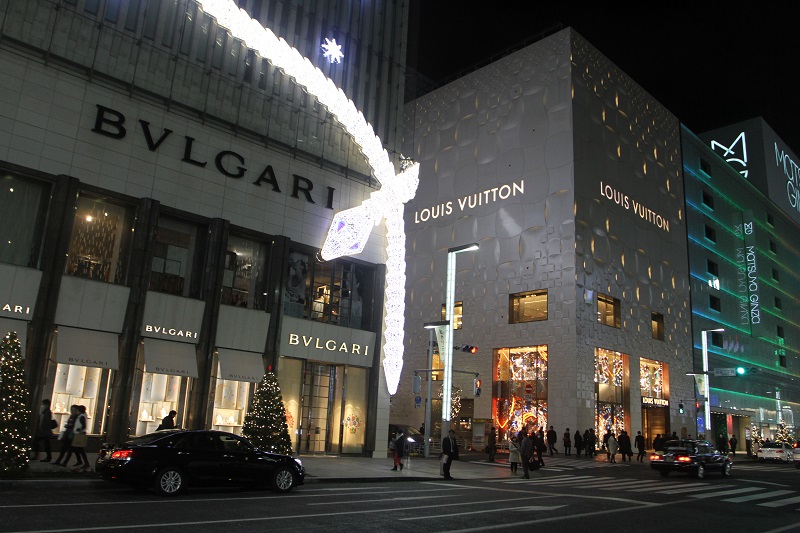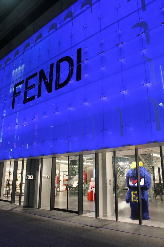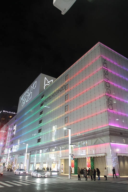 ‘We’re sorry!’ says the little picture after the ATM had declined my debit card. I eventually found an ATM that gave me cash; I should have gotten some Yen at the airport, though. Amazingly, Japan still transacts in cash. You put your cash in a little tray, and the change gets put back in it with your receipt, a little ritual. It does seem to me that most stores grudgingly accept credit cards and maybe they do so for me just because I am a foreigner.Japanese porcelain maker Noritake has moved their store from Akasaka to the Ginza district, and I eventually found it. This set of mini serving plates is gorgeous! .. just a little pricey at US$240 for the set. And it’s not like I have 5 people over every other night at my house to serve up little tidbits to! (unfortunately).Yes, it is Christmas in Japan as well. (Missing : the pervasive Christmas jingles playing in the stores the way we do it in US shopping malls). There are little Christmas trees lining the street in the Ginza district, with wishes of Merry Christmas in the windows, and a Happy Holidays here and there, as well.I love this lit up creature – a salamander, maybe? – on the Bulgari jewelry store.Lots of blue in the Fendi storefront, and check out the fluffy creature (from the Blue Lagoon?) in the window.It’s just after 10 pm, and the Apple store’s employees are wiping away the days smudges from the demonstration devices in the store.One of the flagship department stores, the Matsuya Ginza. By day there is a Japanese national flag (the red sun on the white) on a flagpole on top of the building.