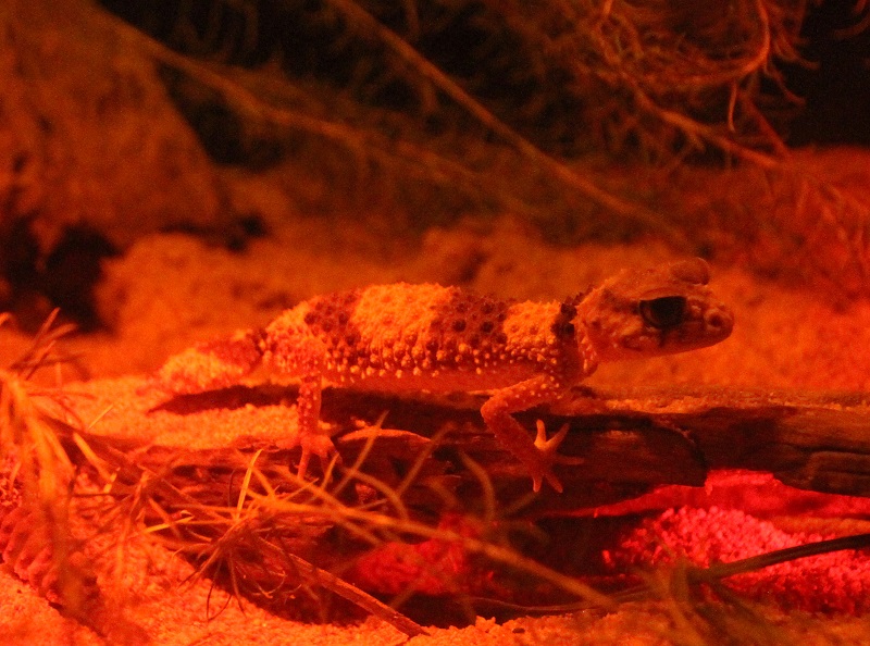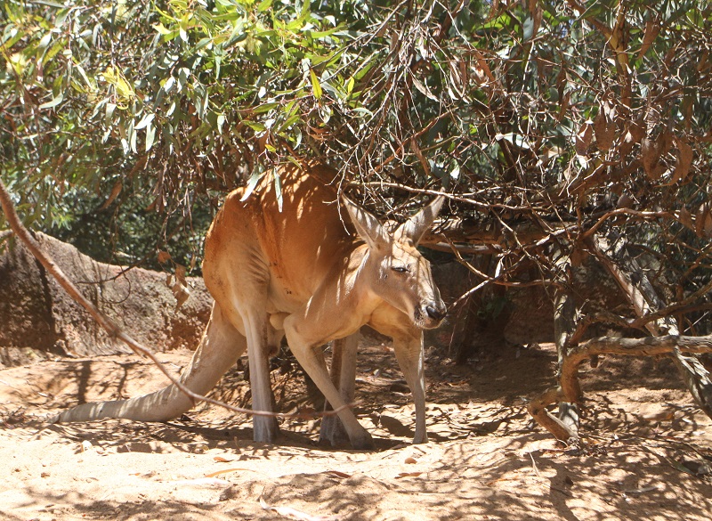 The black-necked stork is found in Northern and Eastern Australia. The sharp bill is used to impale frogs, fish or even large crustaceans in the water.The blue-winged kookaburra is the largest of the kingfisher family and can live for as long as 20 years. They are found in North-west Australia.Red kangaroos are the largest living marsupials, and found in the arid central parts of Australia. They are herbivores. The Western Grey kangeroo is smaller, and wallabies are smaller still.This little nocturnal creature is the Northern Quoll, a carnivorous marsupial. (The enclosure is dimly lit with red light). They are under threat of extinction from eating the poisonous cane toads (a pest in Australia), and from falling prey to feral cats in the wild.And here is a Banded Knob-tailed Gecko They are found in the Pilbara area – a large, dry, thinly populated region in the north of Western Australia.The White Rhinoceros is NOT an indigenous Australian animal (of course). The beautiful beast was standing in the shade far away, and then lumbered over to come and take a few sips of the water, right in front of us, flapping its ears.