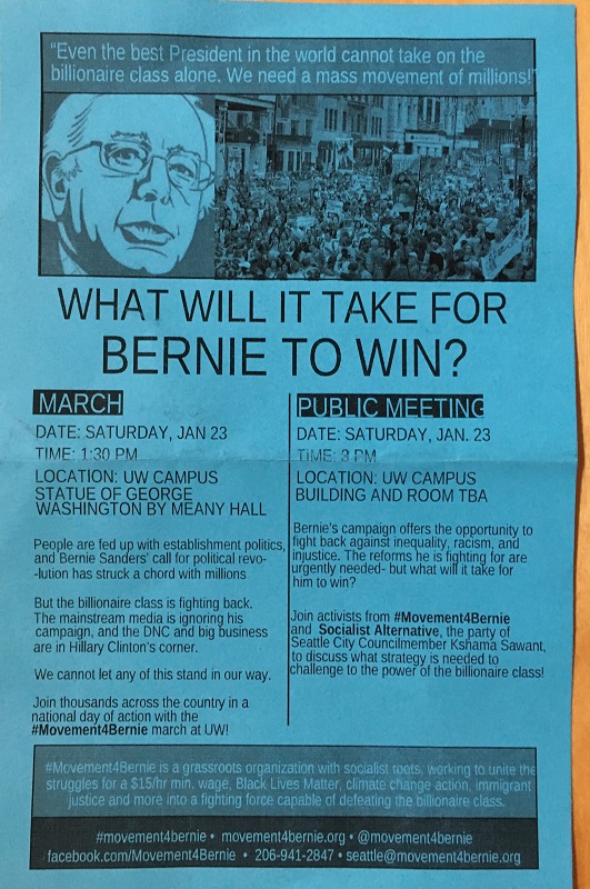 I visited one of my favorite stores in Seattle, the University of Washington bookstore, on Saturday. Outside the bookstore, two Bernie Sanders campaigners (students) had a table set up and they were handing out Bernie Sanders flyers (Yes, I’ll take one, I said), .. ‘and would I come to the Movement for Bernie march next Saturday?’ Well, ‘I will try’, I said. The first votes in the State primaries start with Iowa’s caucuses on Feb 1st. After March 1st, the so-called Super Tuesday, a clearer picture should emerge as to who the Republican nominee for President may be, and who the Democratic nominee may be.