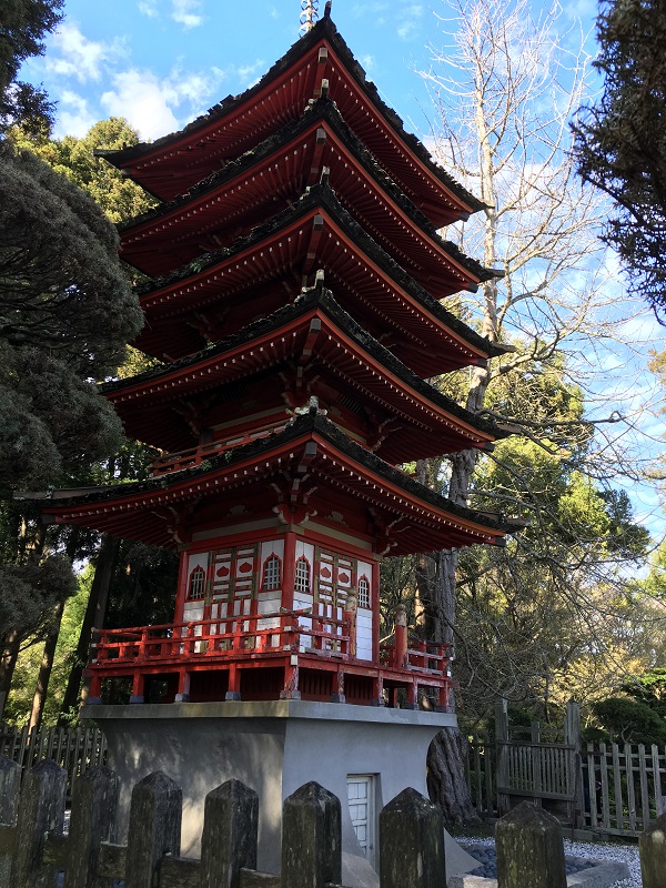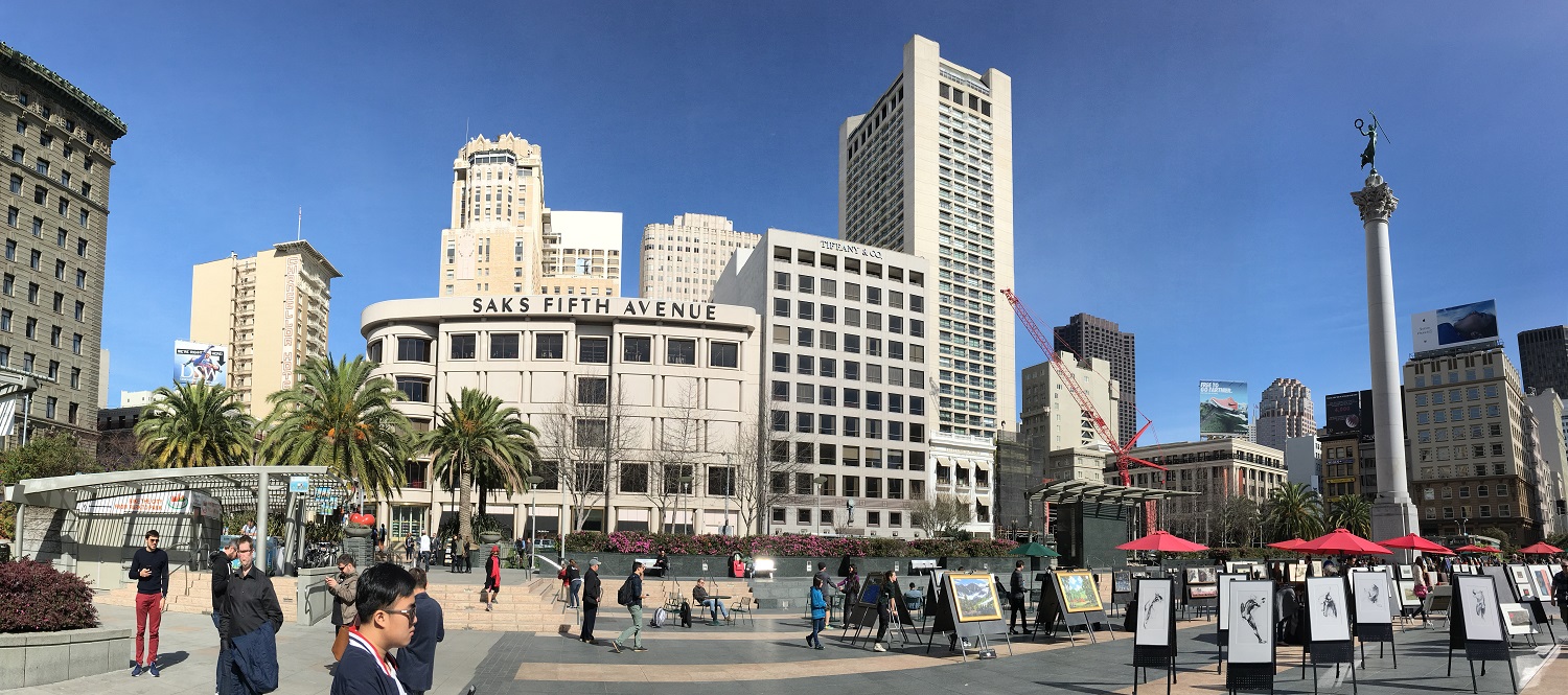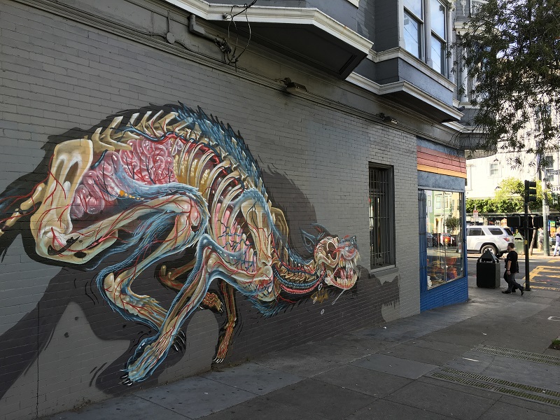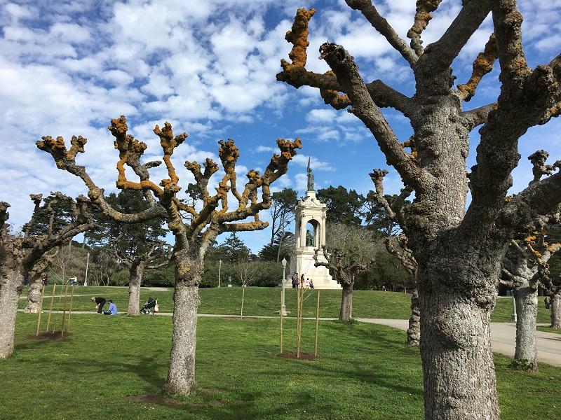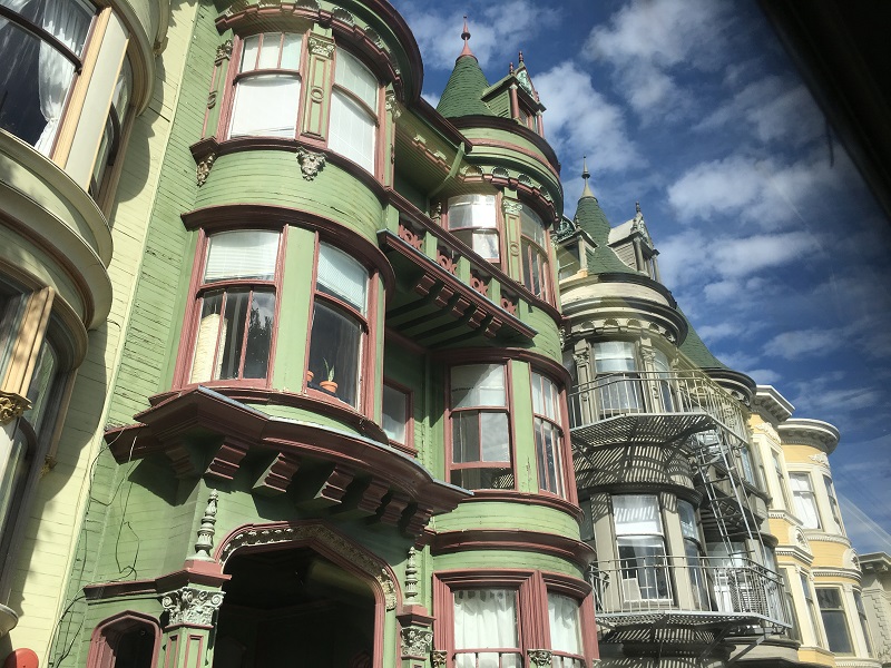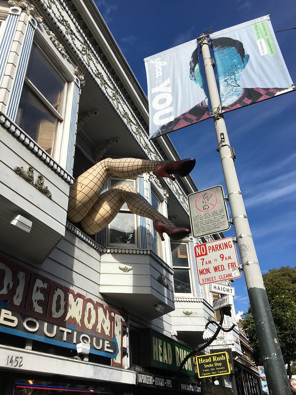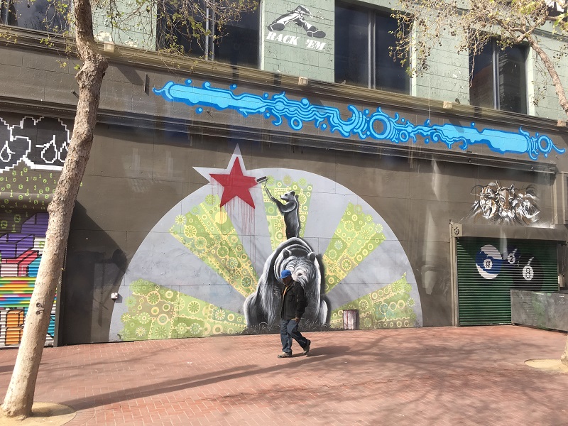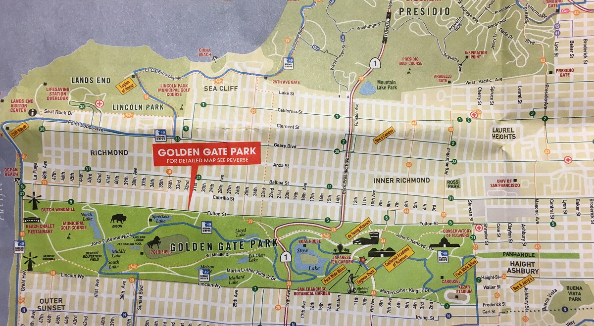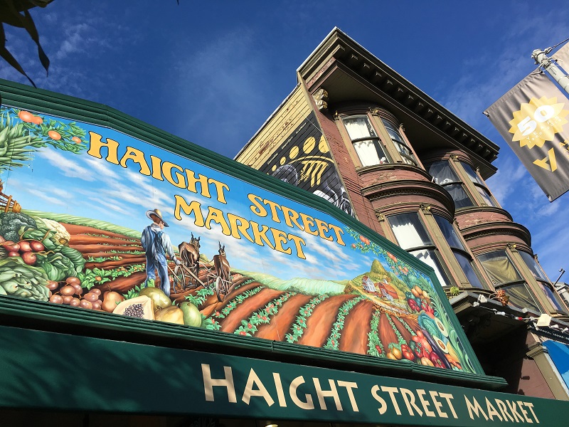 Here’s Union Square, looking west. Union Square got its name from the pro-Union rallies held there on the eve of the Civil War. The monument on the right is a tribute to the sailors of the United States Navy.I love the colors and the ornate tiling on this building on Market Street, now housing an Old Navy clothing store.I’m on the No 5 bus on the way to Golden Gate Park. The bear would be a reference to the one on California’s State flag, but I’m not sure what the Soviet star (?)’ that the little bear is painting means, or symbolizes.These Victorian row houses are found on many streets in San Francisco. These ones are on McAllister Street. This pagoda is in the Japanese Garden inside Golden Gate Park.This open space with its weird trees, and the monument in the distance, are in the Botanical Garden inside Golden Gate Park. I did not go over and check out the monument.The Haight-Ashbury, named for the intersection of Haight and Ashbury streets, has some really weird and attention grabbing store fronts!Street art in the Haight-Ashbury. Watch out for the were-cat with the mean shadow.The Street Market offers fruit and veggies from the fertile Central Valley close by, I’m sure.Here is a vintage street car. It is at the corner of Van Ness and Market Street.Golden Gate Park is a very large green space in the city. It is to San Francisco what Central Park is to New York City.