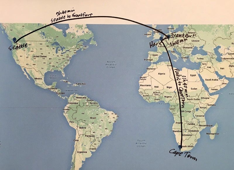It is time to start my journey to South Africa on Saturday morning. I’m making a stop in Frankfurt before picking up Air France there for Cape Town. I tried to generate a graphic itinerary in Google Maps but ended up drawing the flights in. Google only offers graphics for flights between one start point and one end point. As for driving, it offered a fascinating road trip from Paris to Cape Town : 172 hrs of drive time, with a ferry crossing across the Mediterranean, following the Trans-Sahara Highway through Algeria and Niger, and then another ferry to get across the mighty Congo River at Brazzaville. Now that would be a trip to remember.