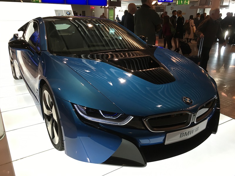 Here’s our arrival into Frankfurt airport, from Hamburg. In the distance a Boeing 747 is just being pushed into the hangar (for some maintenance, I’m sure).And I stopped by this mean machine on the way to my gate for the flight to Seattle, the BMW i8. Competition for the Tesla? Maybe.